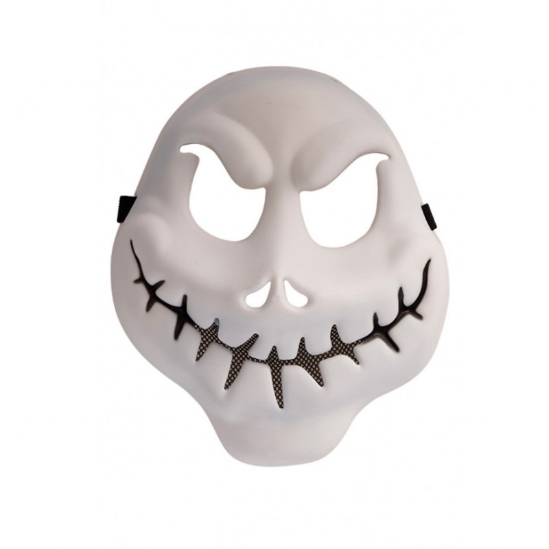 Maschera Jack Skeletron in plastica rigida con le sembianze di uno spaventoso fantasma dalla bocca cucita, adatta per travestimenti horror e Halloween.