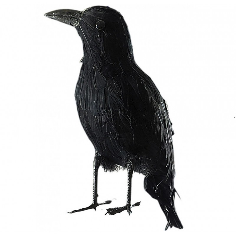 Corvo alto cm 22 ricoperto di piume nere, adatto come originale decorazione di fantasiose scenografie teatrali o per completare un travestimento di Halloween.
